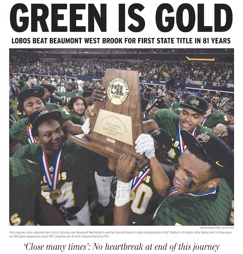 ![]() ARLINGTON - After knocking and knocking and knocking on the doorstep of bringing home a state championship, the Longview Lobos kicked the door down on Saturday. Behind a gritty effort from the Longview offense and an even more gutsy effort from the Lobo defense, Longview claimed the Class 6A, Division II state championship and a perfect 16-0 season with a 35-34 win over Beaumont West Brook on Saturday at AT&T Stadium. Longview brings home its first state championship since 1937 in its fourth trip to the championship since that title 81 years ago in front of a crowd of 48,421. After grabbing a first-quarter lead, Longview chased West Brook (13-3) throughout up until claiming a 35-34 lead with 4:42 left in the game. From there, the Lobo defense stopped a potent Bruin offense by forcing its first turnover of the game. Junior quarterback Haynes King finished 16-of-27 passing for 423 yards and two touchdown passes to pick up title game offensive MVP honors. King added 65 rushing yards, including a 25-yard touchdown run. Kamden Perry added another record to a storied season, finishing with eight catches for 218 yards - a Class 6A state championship game record - with a 77-yard touchdown haul. Junior Kaden Kearbey grabbed three catches for 87 yards, including a 40-yard score in the the second quarter. Fellow junior Kyas Moore had a crucial 54-yard haul on the go-ahead drive in the fourth quarter. On the ground, Jessie Anderson finished with two touchdowns on runs of three and two yards, the final putting Longview head by one point with 4:42 left. Defensively, Jephaniah Lister, who garnered defensive MVP honors had a team-high 12 tackles. Tyshawn Taylor followed with 11 tackles, two for loss, and forced a West Brook fumble with a big hit from Ja'Vontae Writt and recovery from Michael Martin with 1:02 left. Isiah Rodgers had 10 tackles with a pass broken up and Robert Pierce and Jaylon Allen were each credited with half sack. JK Martin connected on a 28-yard field goal in the fourth quarter, had four touchbacks and averaged 44 yards on two punts for the Lobos. Longview finished with 569 yards of total offense to 493 from the Bruins, who led 28-20 at halftime. The two teams exchanged turnovers on downs to start the second half. Longview pulled to within two, 28-26, on a 25-yard touchdown run from King to cap a quick five-play, 76-yard drive. The two-point attempt from the Lobos failed. West Brook responded methodically with a 10-play, 75-yard drive to pull ahead, 34-26, with 11:34 left in the game. The Lobos marched down the field before a drive stalled at the 11, setting up Martin's 28-yard kick to pull within five, 34-29, with 8:17 showing. Allen had stop for no gain and Rodgers followed with back-to-back tackles to force a Bruin three-and-out. King hit Kearbey for 11, Moore for 54 and Anderson put Longview ahead, 35-34, with 4:42 left. The Lobo defense, which had allowed 28 points in the first half and six in the second to that point, bowed its neck with the combo of Taylor, Writt and Martin coming up with the big play. King converted a third down and Keilyn Williams ran for 26 yards around the outside to send the Lobos into victory formation in a state championship game for the first time in 81 years. |